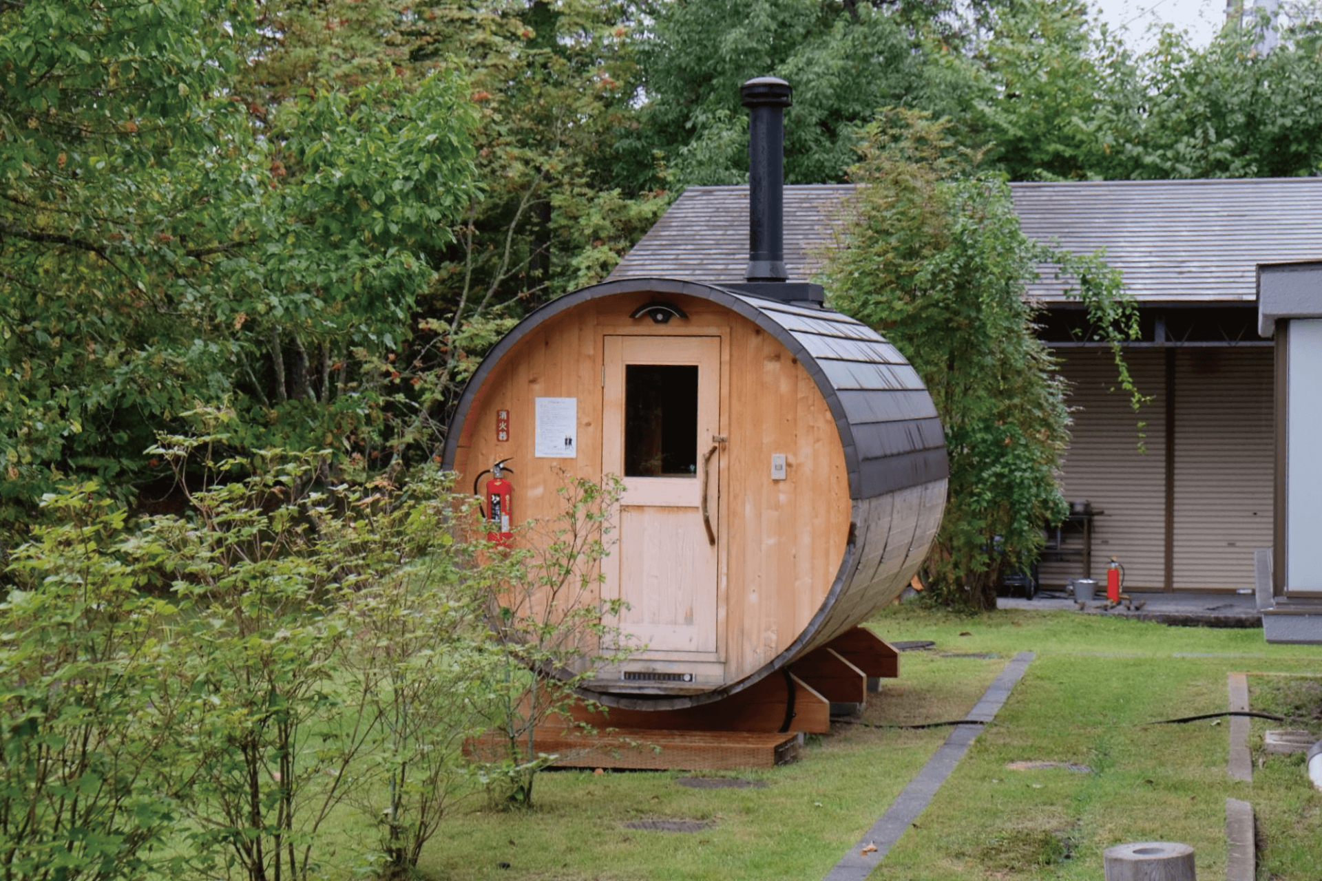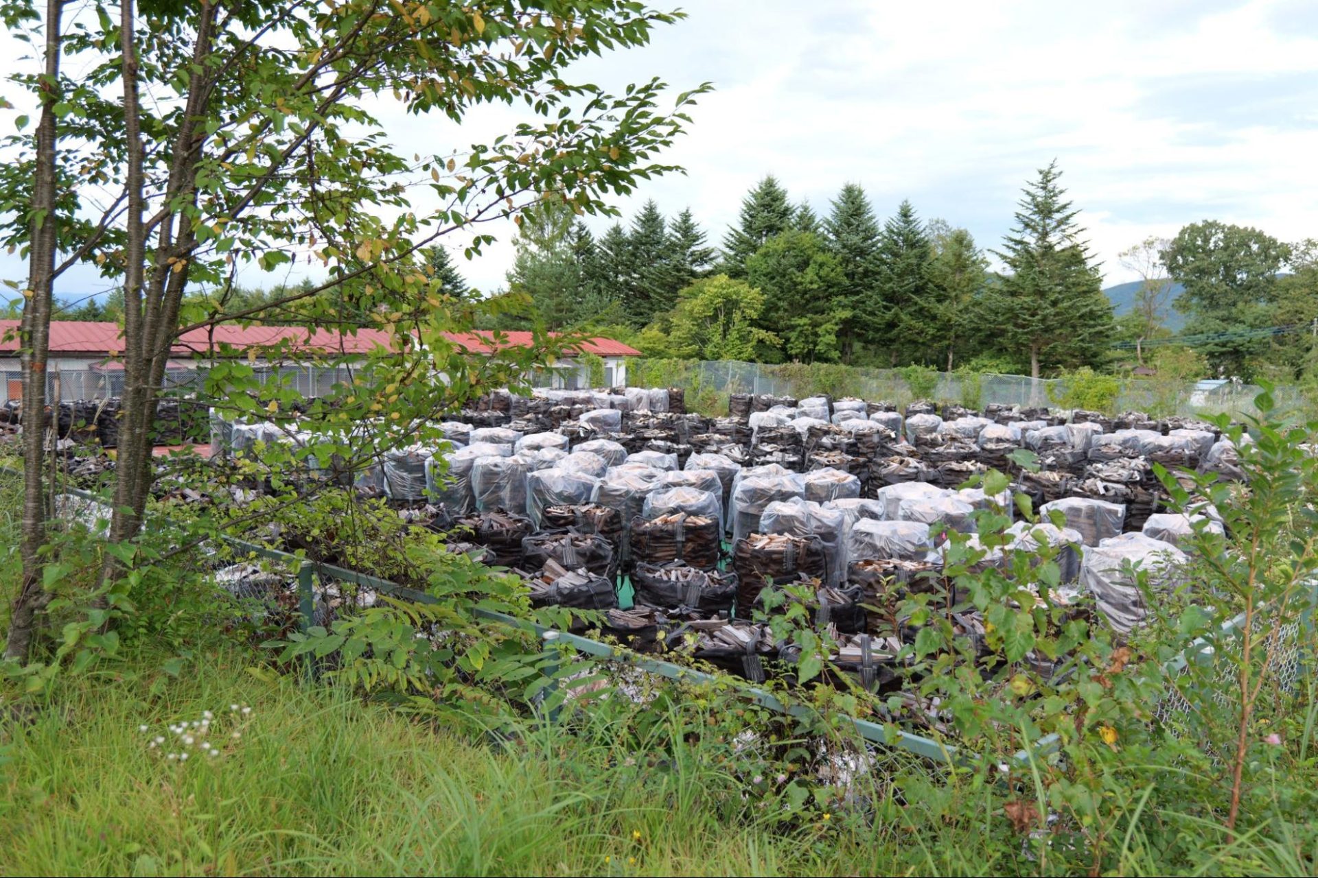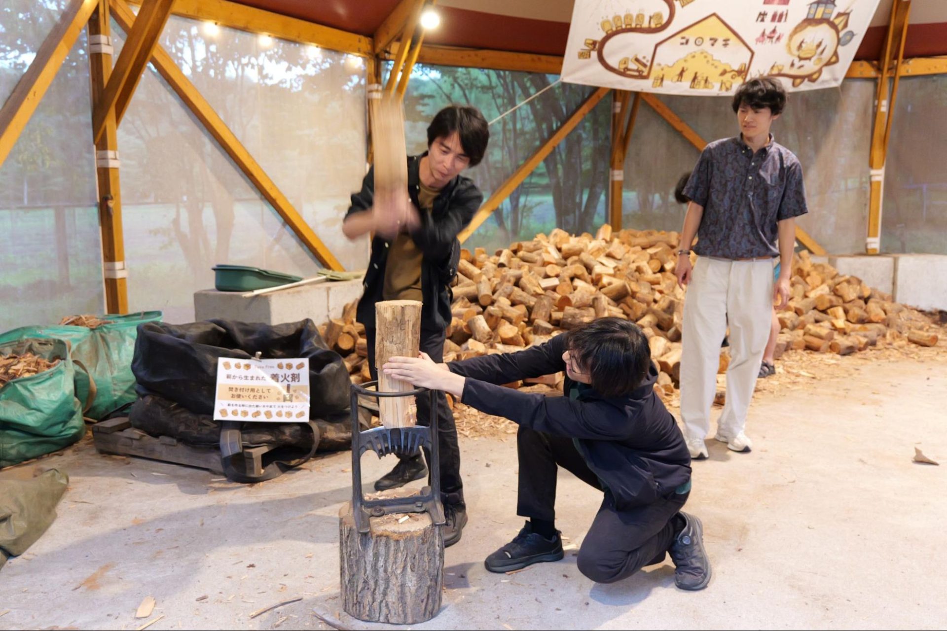 キャンプでも使いやすいサイズ感に揃えられた薪が並び、バブル期に建てられた別荘兼テニスコートを活用した薪保管スペースは、圧巻でした。