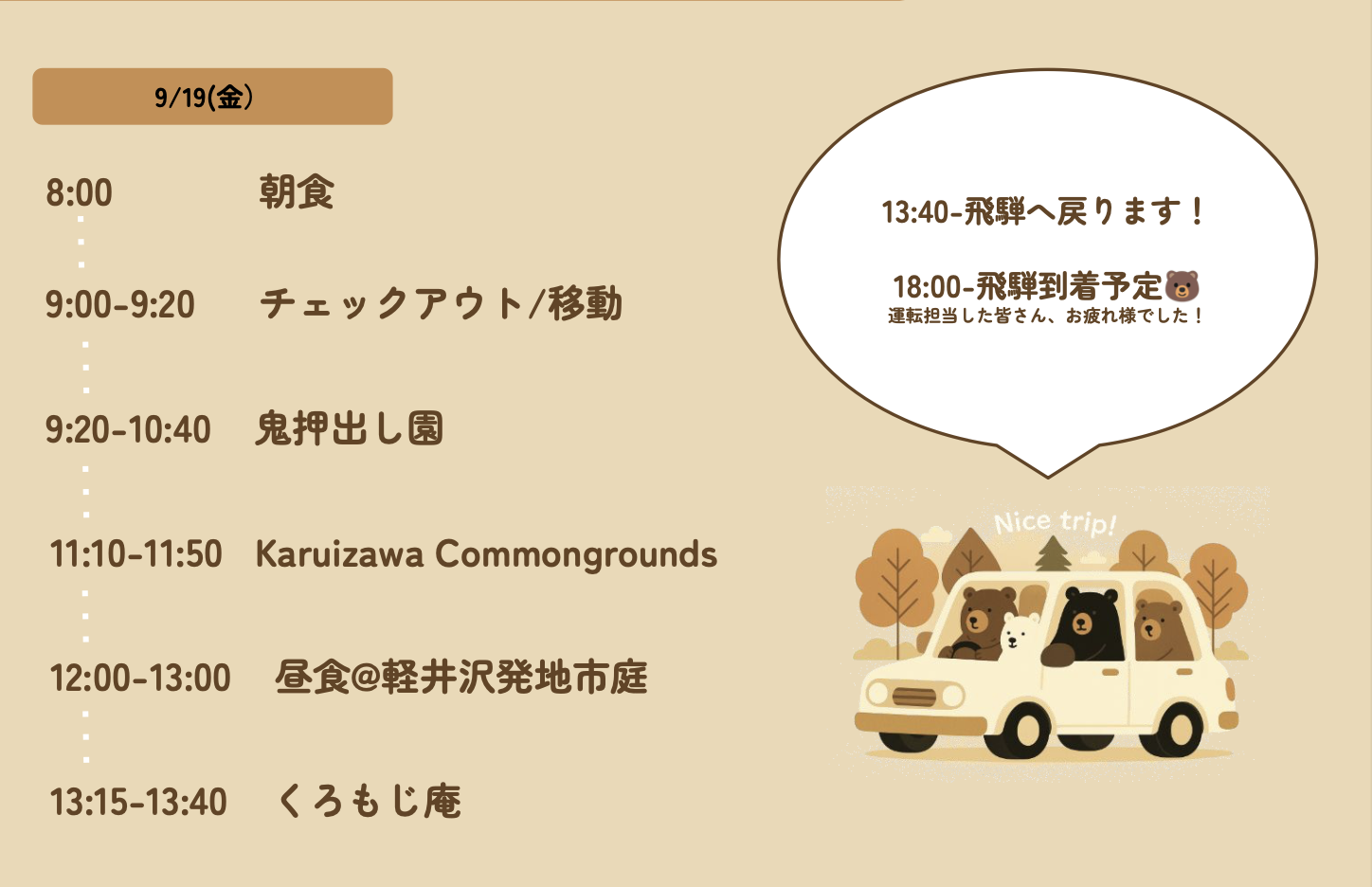 その後、『軽井沢発地市庭』や『Karuizawa Commongrounds』、『くろもじ庵』に立ち寄り、お土産を購入して帰路につきました。