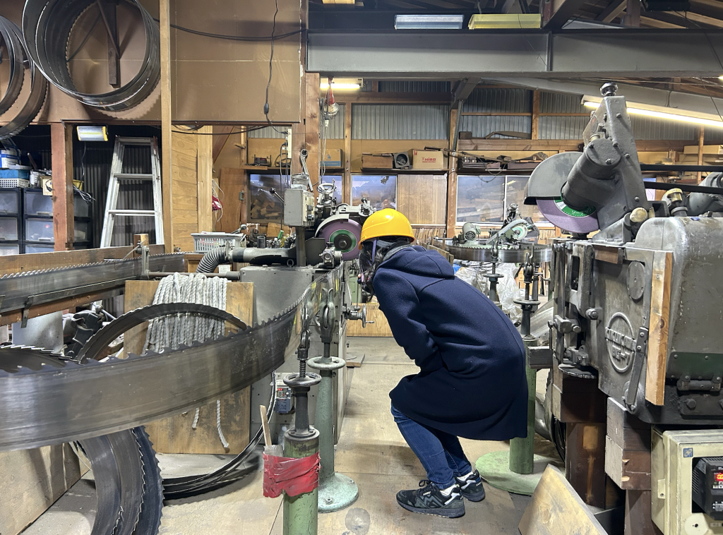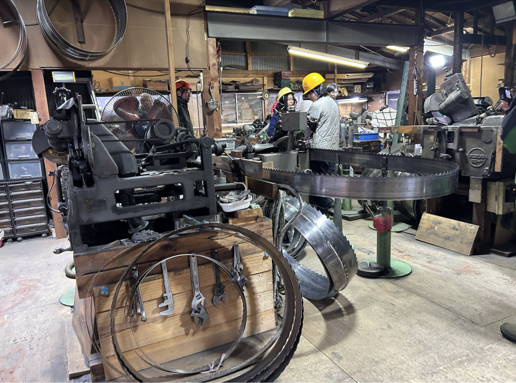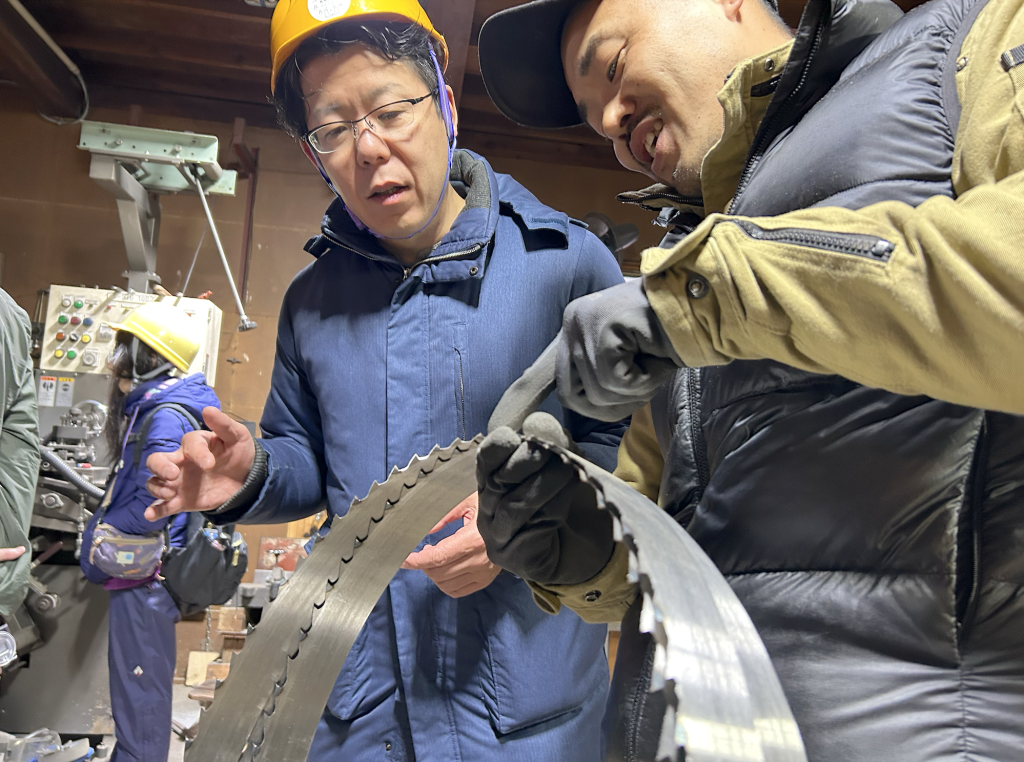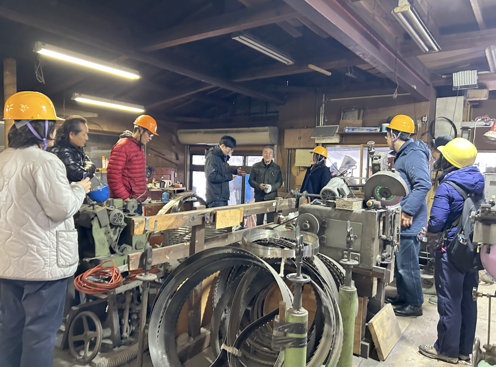 広葉樹の施業、製材・乾燥、そして活用までを実践者から学ぶ講座シリーズの「広葉樹まちづくり学校」。その特別編として「目立(めたて)」にフォーカスした現地見学ツアーを2025年12月に開催しました。製材所で日々使われる帯鋸。その切れ味と調子を左右する「目立」は、木を活かす現場を根底から支える重要な仕事です。しかし、その存在は産地の外ではほとんど知られていません。今回のツアーでは飛騨地域で残り一軒となった目立屋「宇野鋸加工所」と飛騨地域の6つの製材所を訪問し、最後は宇野さんが営む居酒屋での交流会の様子をお届けします。