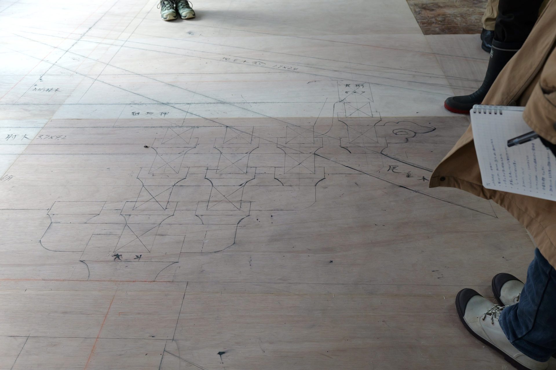 朝日が差し込む工場の床には、塔の原寸図が描かれた合板が敷かれていました。