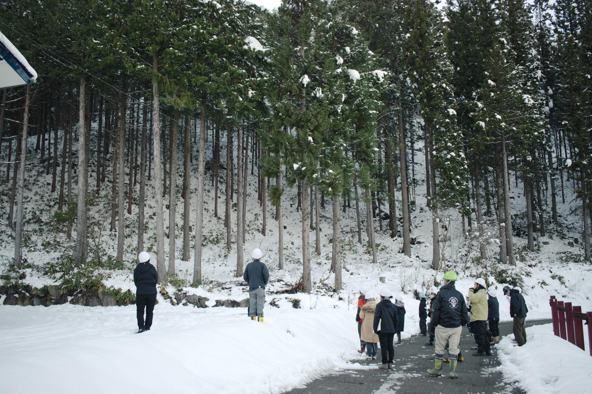 雪の影響で予定地には入れなかったのですが、近くの間伐後の森をご案内いただきました。