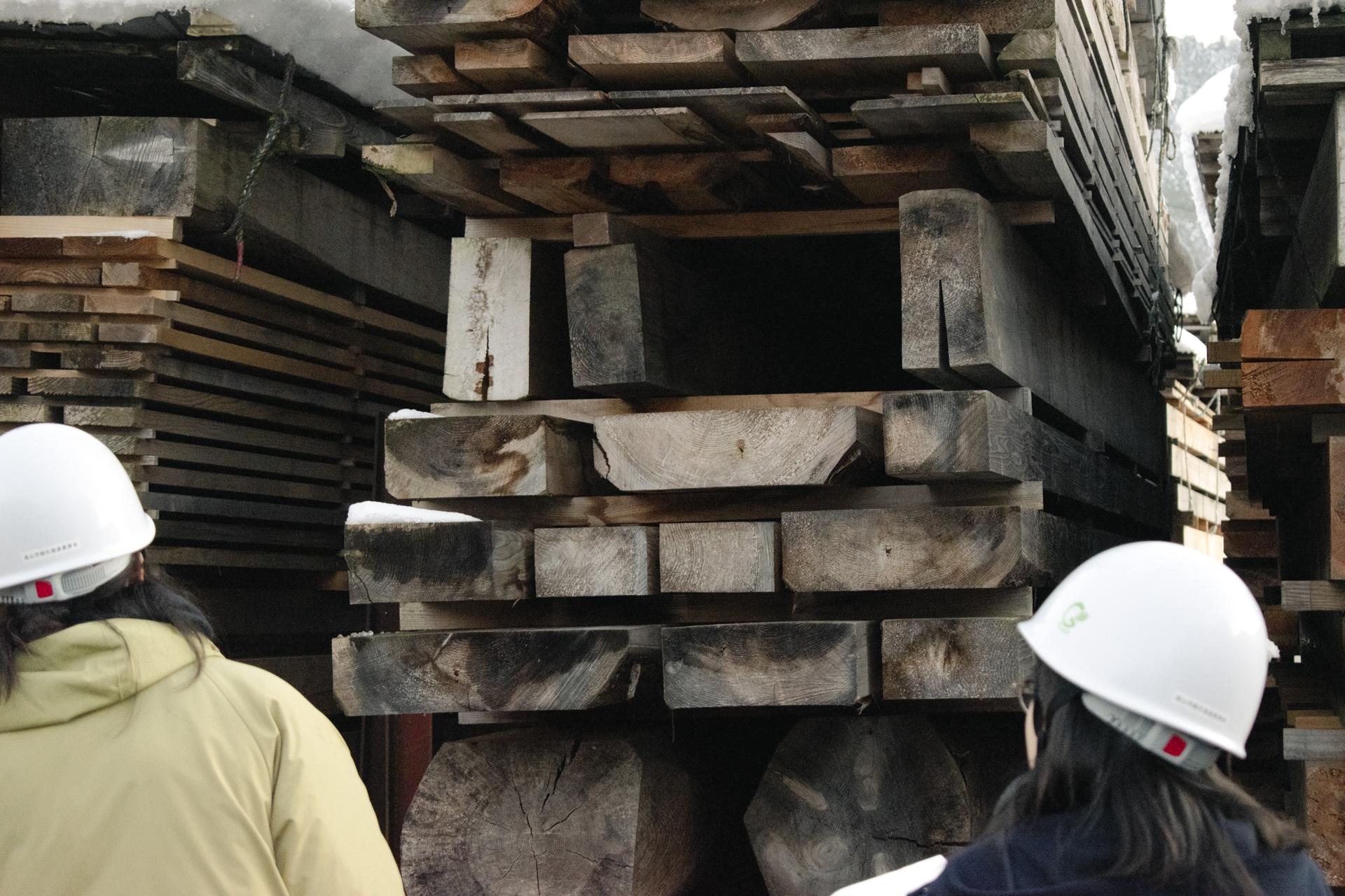 土場には美しい桟積みが並び、桟跡が残らないよう二枚重ねで乾燥させるなど、丁寧なお仕事を見ることができました。