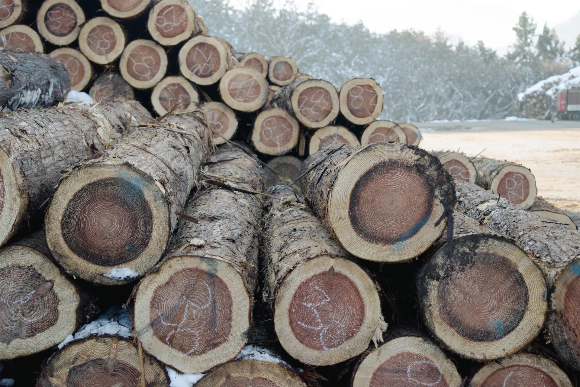 伐採後、検尺された丸太が整然と積まれていました。