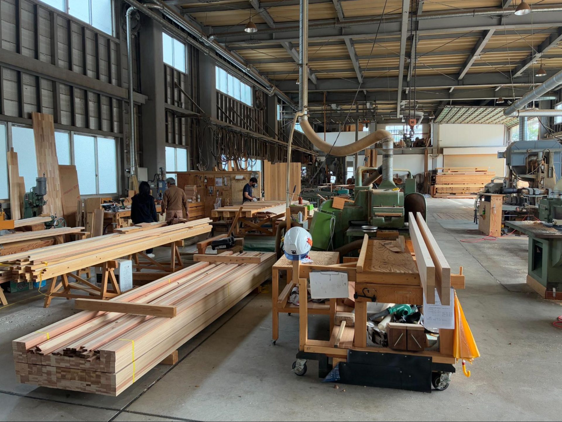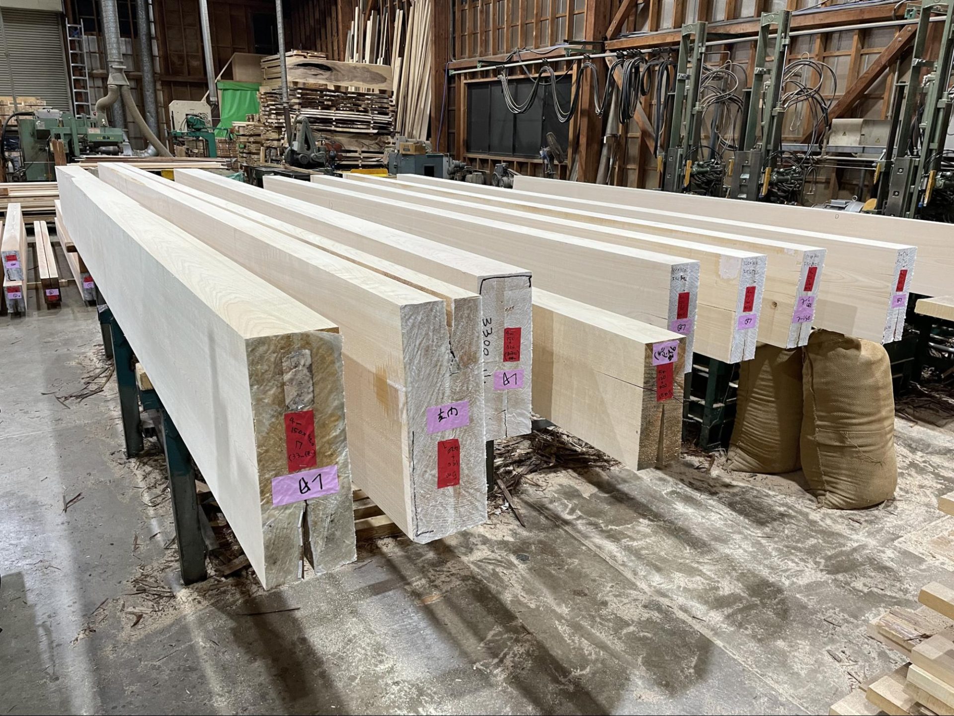 最長12mまで挽ける製材機に中温乾燥室を備え、木組みや伝統構法といった古き良き技術の継承や存続に欠かせない素材を提供すべく注力する。