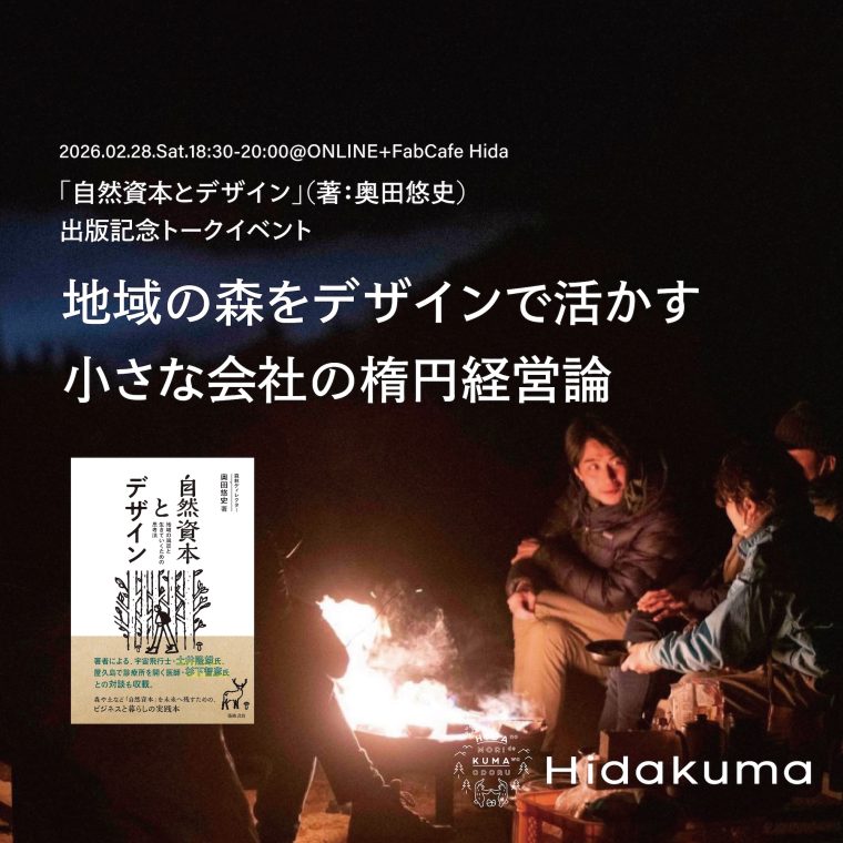 2025年12月に刊行された『自然資本とデザイン 地域の風景と生きていくための思考法』(築地書館) の著者で株式会社やまとわの創業者である奥田悠史さんを飛騨にお招きし、奥田さんとも親交が深いヒダクマ代表松本とのトークイベントを開催します。