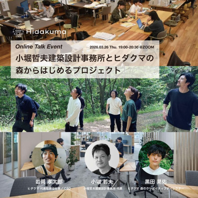 | 19:15-19:25 | これまでの小堀哲夫建築設計事務所 × ヒダクマ協働プロジェクト紹介|黒田 晃佑(ヒダクマ 森のクリエイティブディレクター ) |