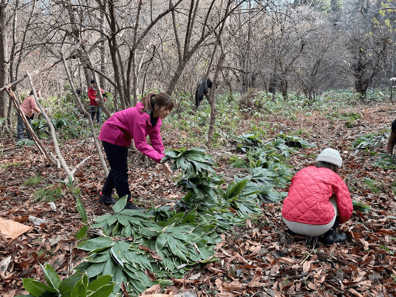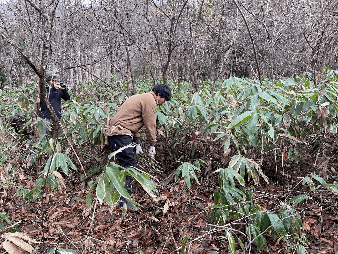 温泉街にある「来福の森」の中で、山主と一緒に森の使い方を考えながら、森の中にある木や笹を使って、みんなで東屋をつくります。