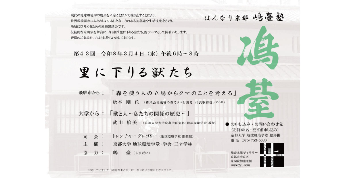 京都大学 地球環境学堂・学舎・三才学林主催の先端の地球環境学の成果を京ことばで練り直す「はんなり京都嶋臺塾」の第44回にヒダクマの松本 剛が登壇します。