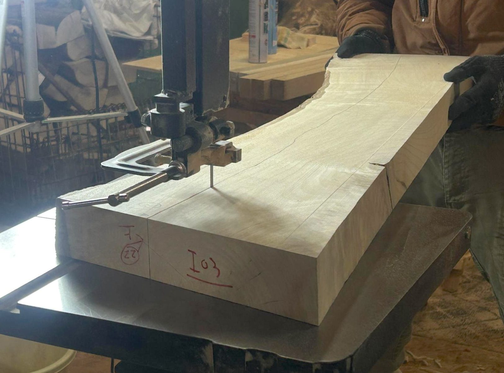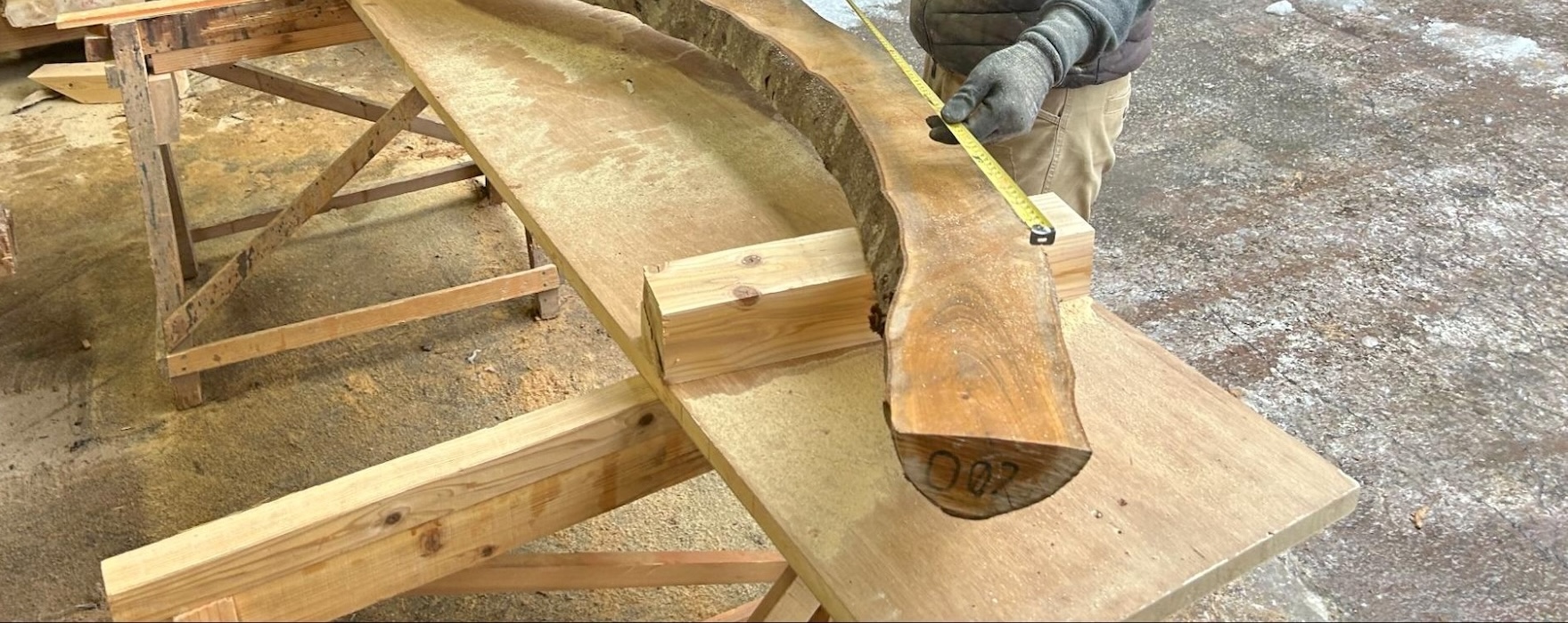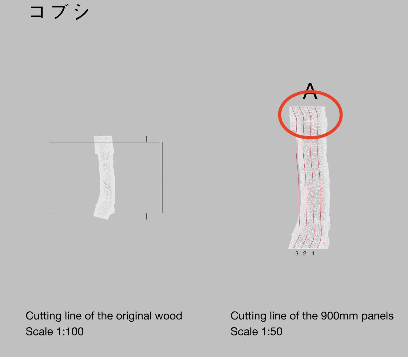 宝が池の森の中で自然に育った製材に不向きな木を使うという前提のもと、できるだけロスを出さないために、元々木が持っている曲がりに沿って部材をカットしていきました。