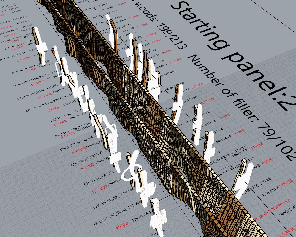 スキャンしたデータを元にカットラインをデジタルで割り出し、切り出したパーツをいかに並べるかをコンピューテーショナルデザインを活用し数百通り検討しました。