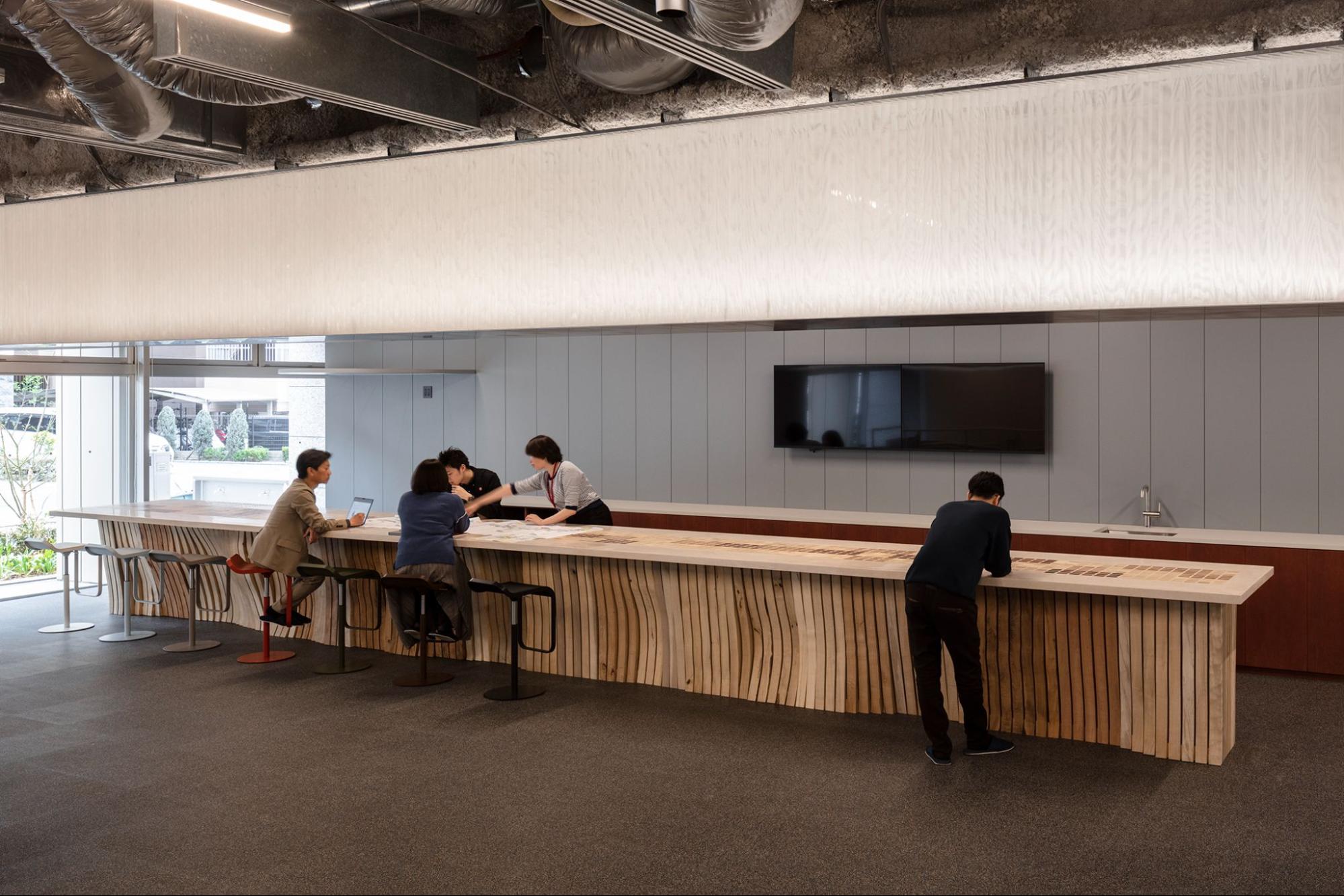 10m×1.1mになるロングテーブルは、本社1階の交流フロアにミーティングやパーティーなど多様な用途に対応できるよう設置されており、訪れた人は、まちの中の木が家具として新しい役割を果たす都市型林業の実験的な活用例を見ることができます。