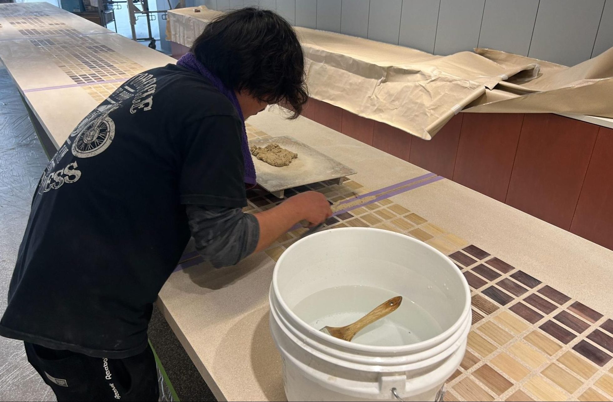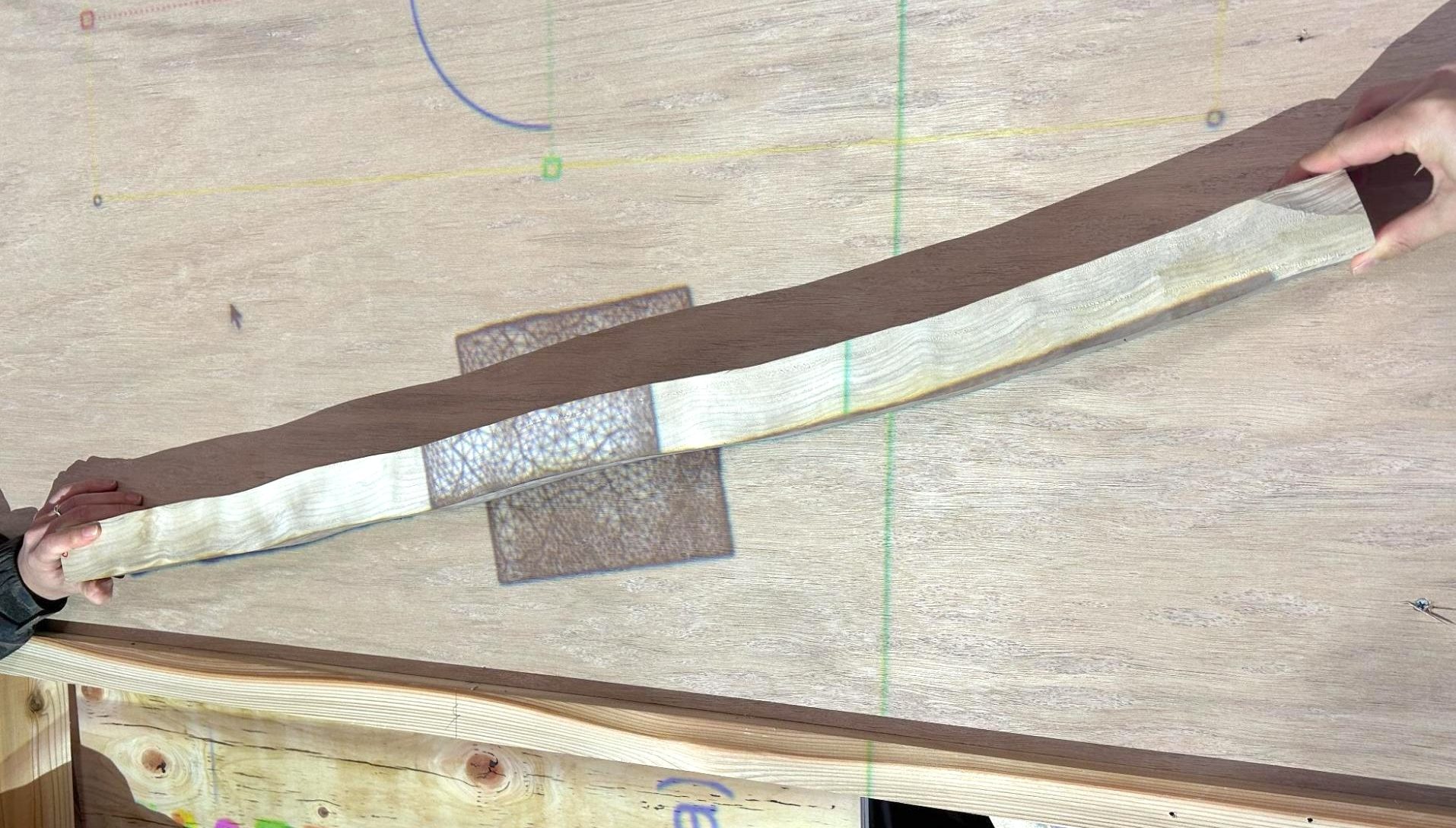 製作では、3Dスキャンしたデータから出力したカットラインをプロジェクターで木に投影することで、墨付け作業を一部効率化。土台には同じ木から切り出したパーツや、異なる木材でも似た曲がりを持つパーツを隣り合わせて配置し、飛騨の木工職人が耳側に残る有機的なラインに沿って少しずつカットラインがずれるように、複数のパーツを組み合わせることで、設計通りの滑らかなウェーブを形づくりました。天板は木テラゾで左官仕上げとし、テーブル脚が天板面まで貫通しているように見えるデザインになっています。