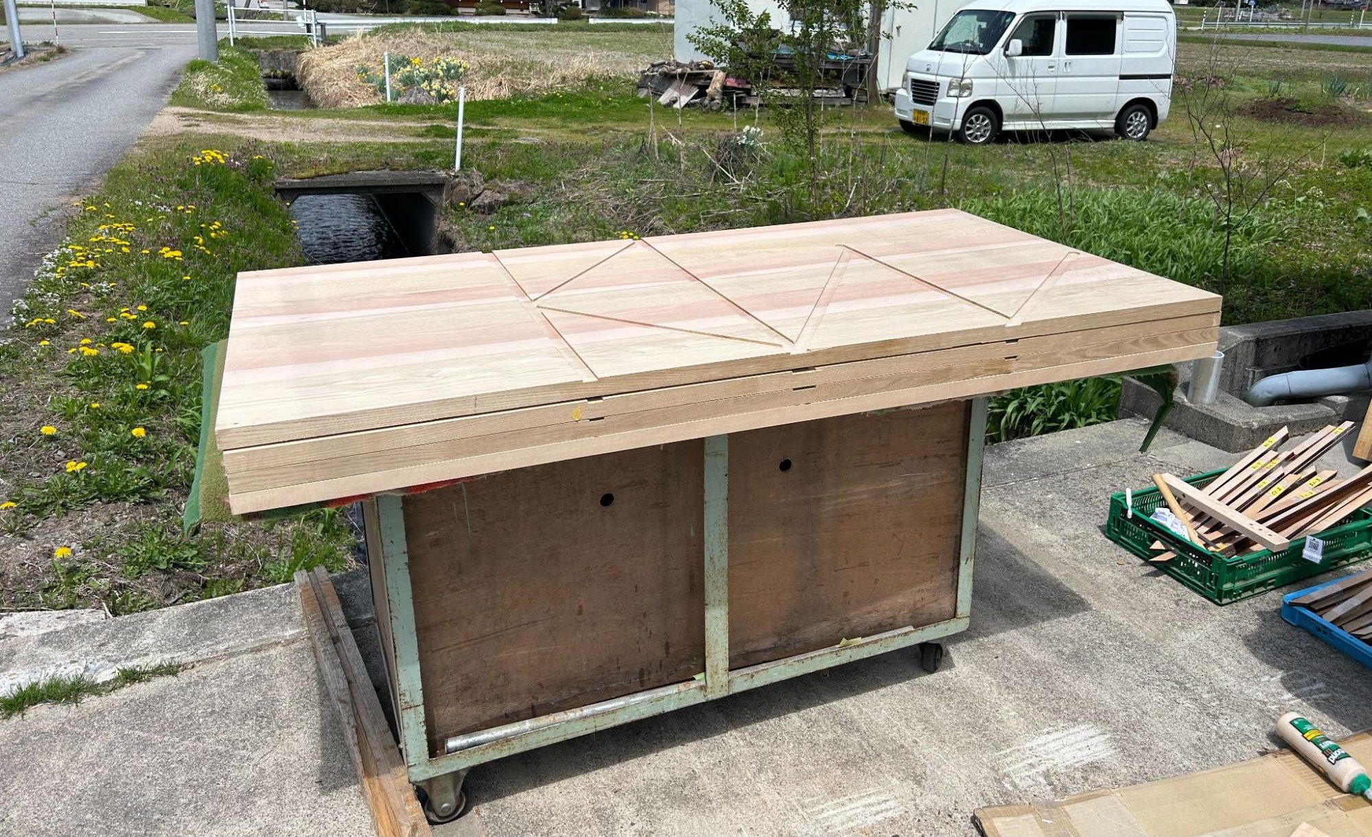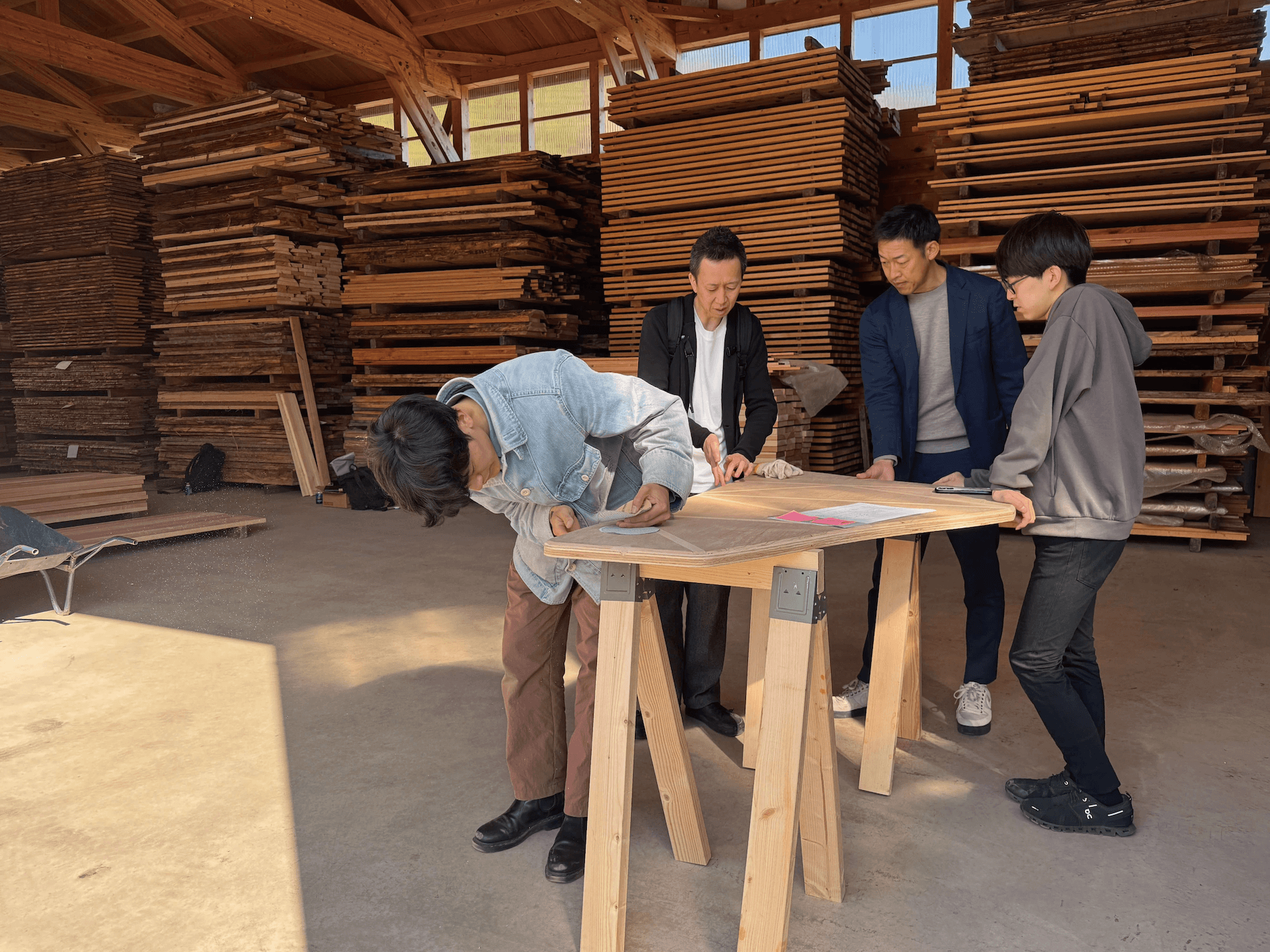 お施主さんと工房で天板を選ぶ体験では、「この組み合わせがいい」「クリ材だけの天板もあっていいのでは」といった会話が生まれ、テーブルだけでなく木材への愛着も深まりました。実際の木を見ながら考えることで、図面を書いているだけでは生まれない発見がありました。