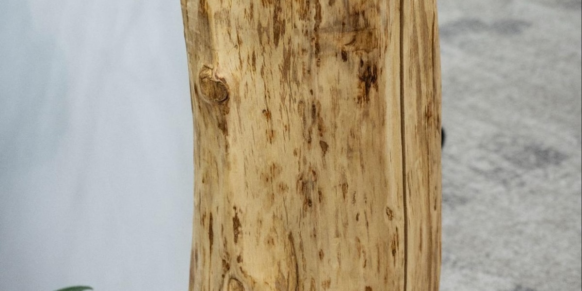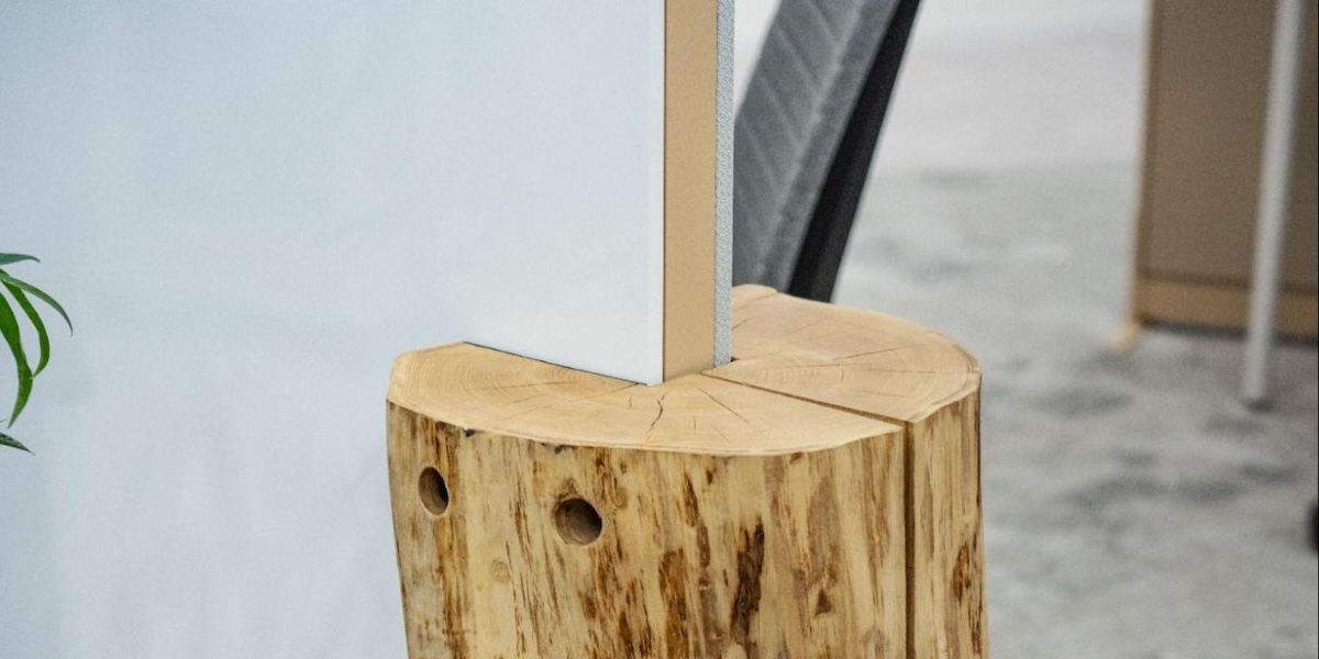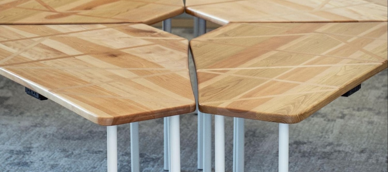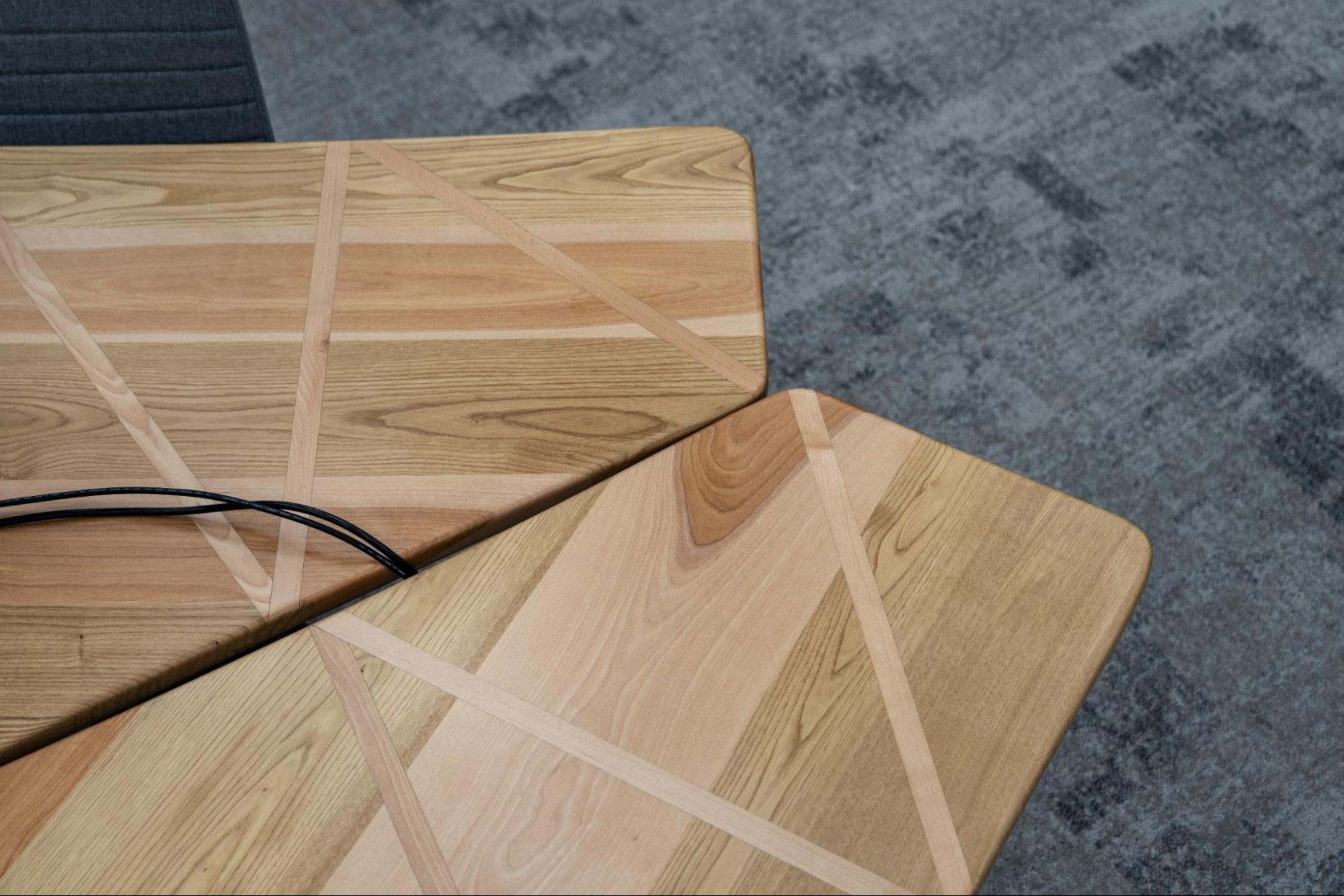 天板材はミズメやトチ、クリとの組み合わせによる幅はぎを採用。小松ウオールの皆さんが飛騨を訪れ、現地で木材の選定を行いました。天板には小松ウオール工業の頭文字「KW」を象った意匠を広葉樹薄板から切り出し、象嵌加工で仕上げています。さらにプロジェクト途中からはパーティション製作も加わり、小松ウオール工業の技術と飛騨の丸太を組み合わせたユニークな間仕切りも誕生しました。