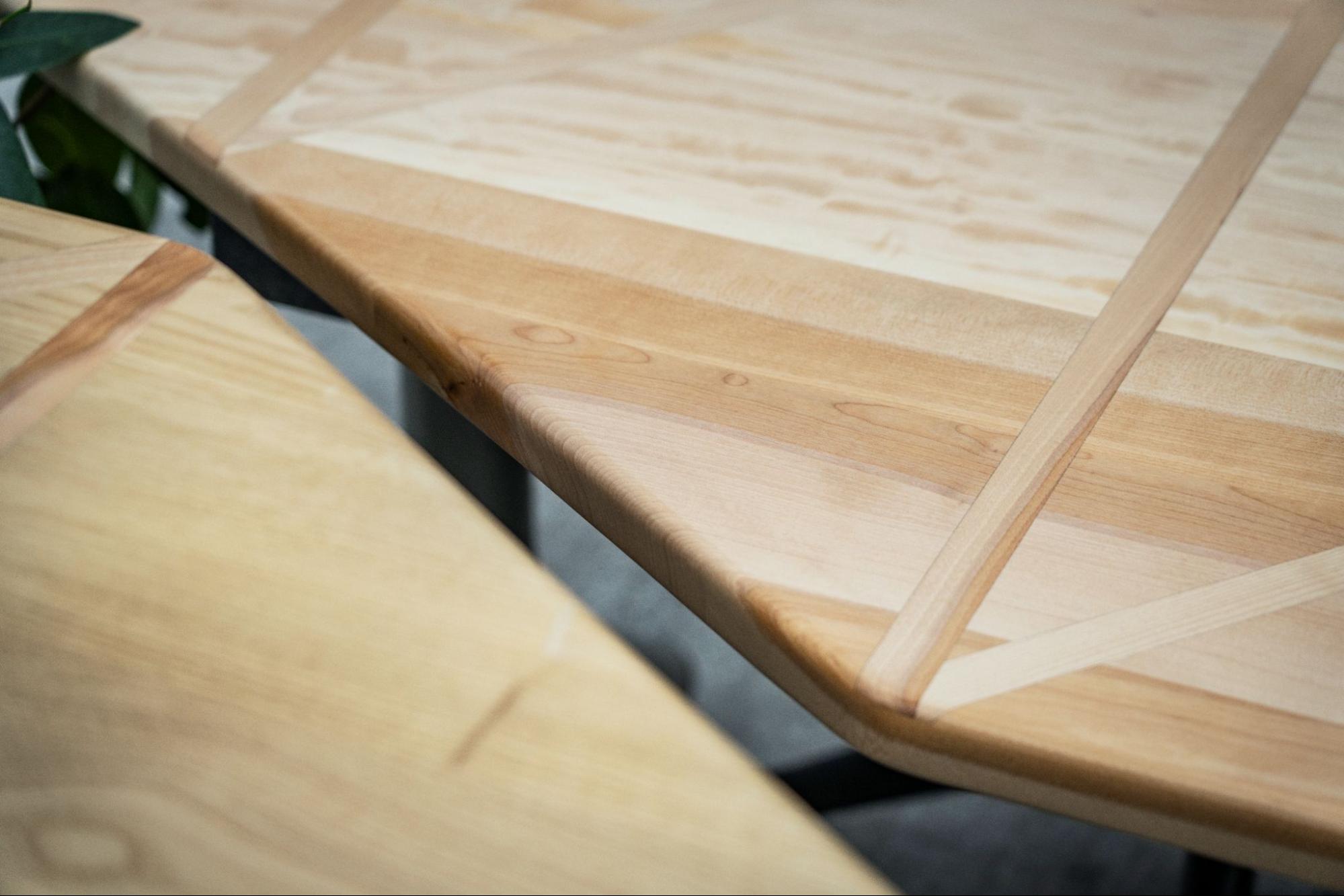 ヒダクマさんからご提案いただいた幅はぎの天板は、4種の木材を組み合わせることで一つひとつのテーブルに個性が生まれ、並ぶたびに新しい景色を生みだしています。