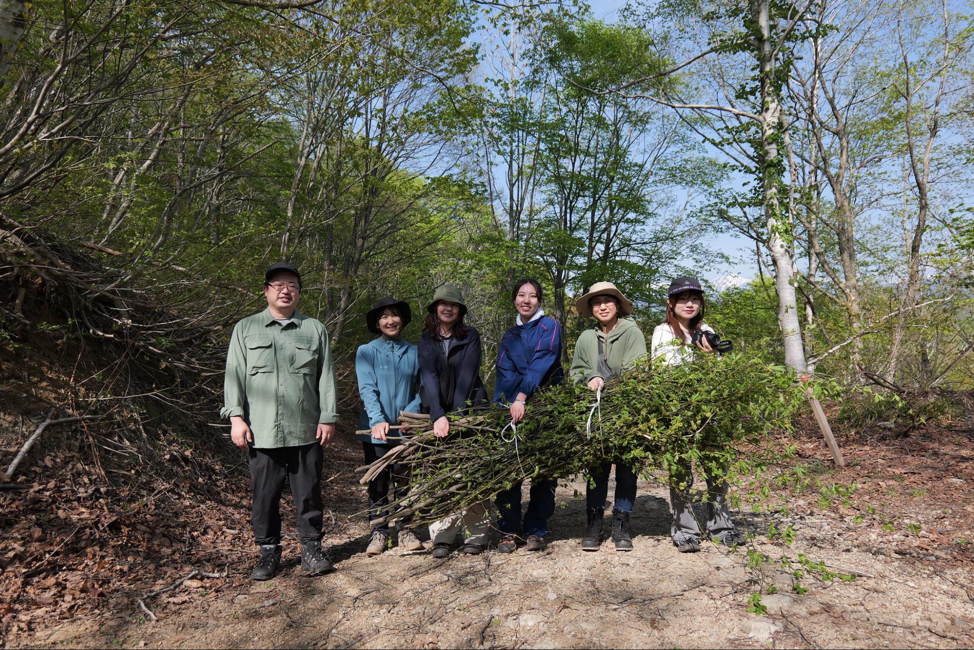 2025年の新緑の季節には再び「tsumuguの森」を訪れ、ギフトの素材となるクロモジを採集。アロマウォーターやオイルの製作はOak Villageと連携し、クロモジの加工は、飛騨市の「ヒダスケ!」プログラムを活用してヤマダヤと飛騨地域の皆さんが交流しながら協力して行いました。