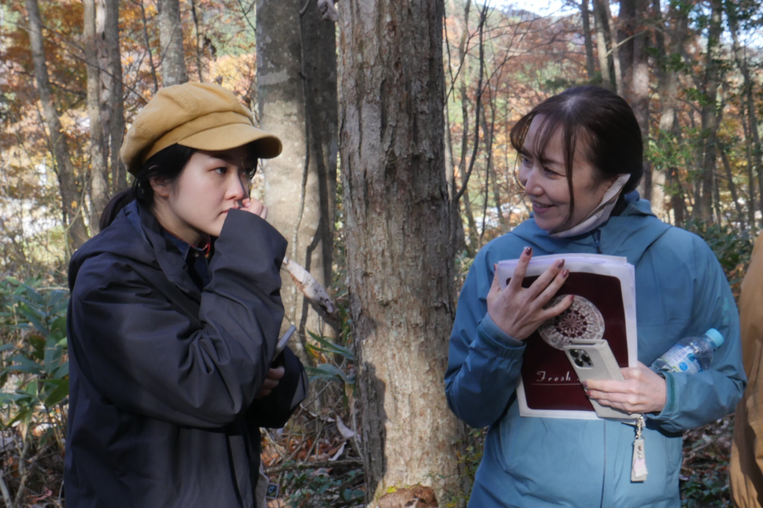 2024年秋に飛騨で行われた合宿では、飛騨市内で森の資源を活かした取り組みを行う事業者を訪問するとともに、プロジェクトメンバーで「tsumuguの森」に入り、この森の未来を想像するアウトプットワークを実施しました。
