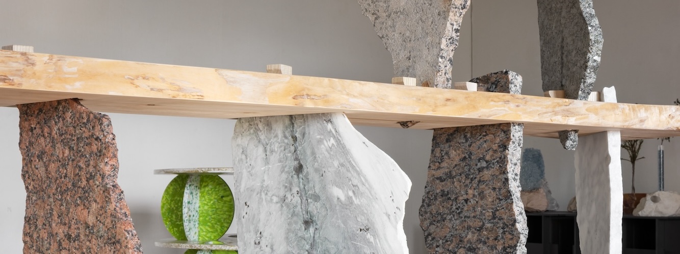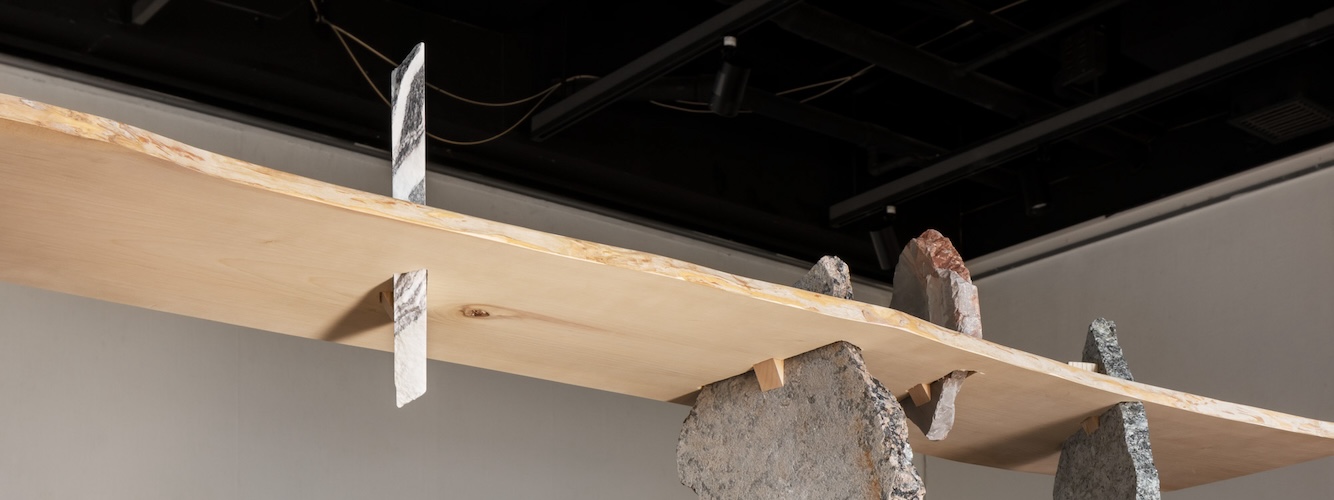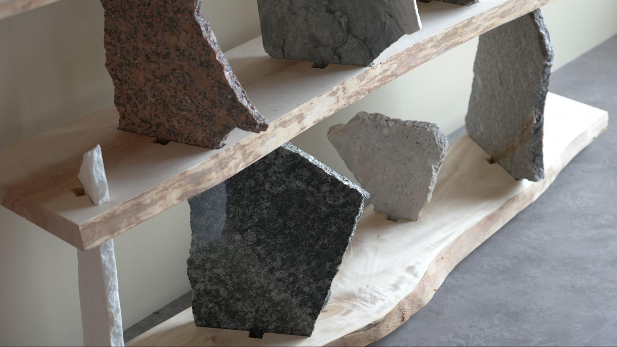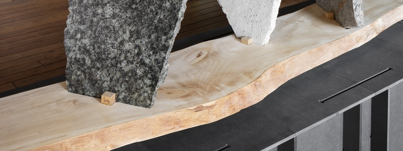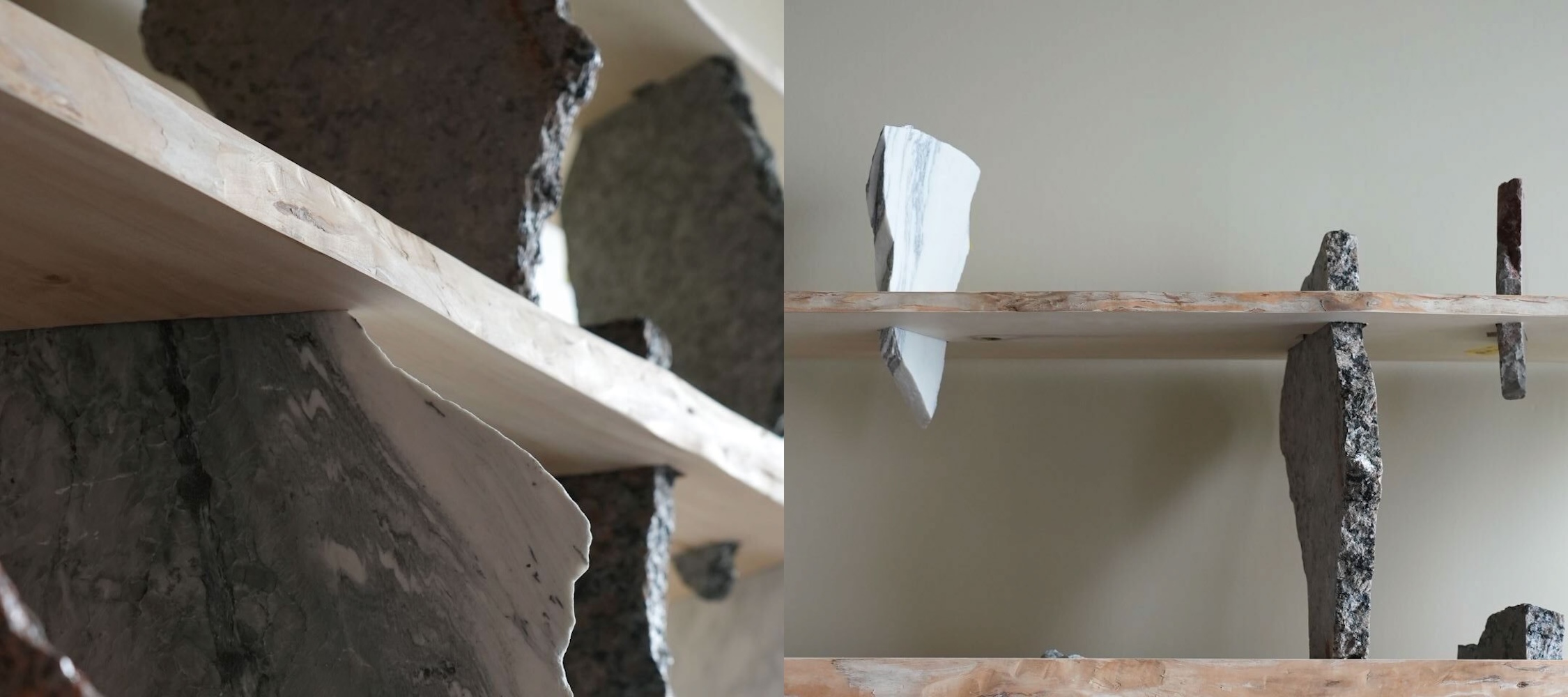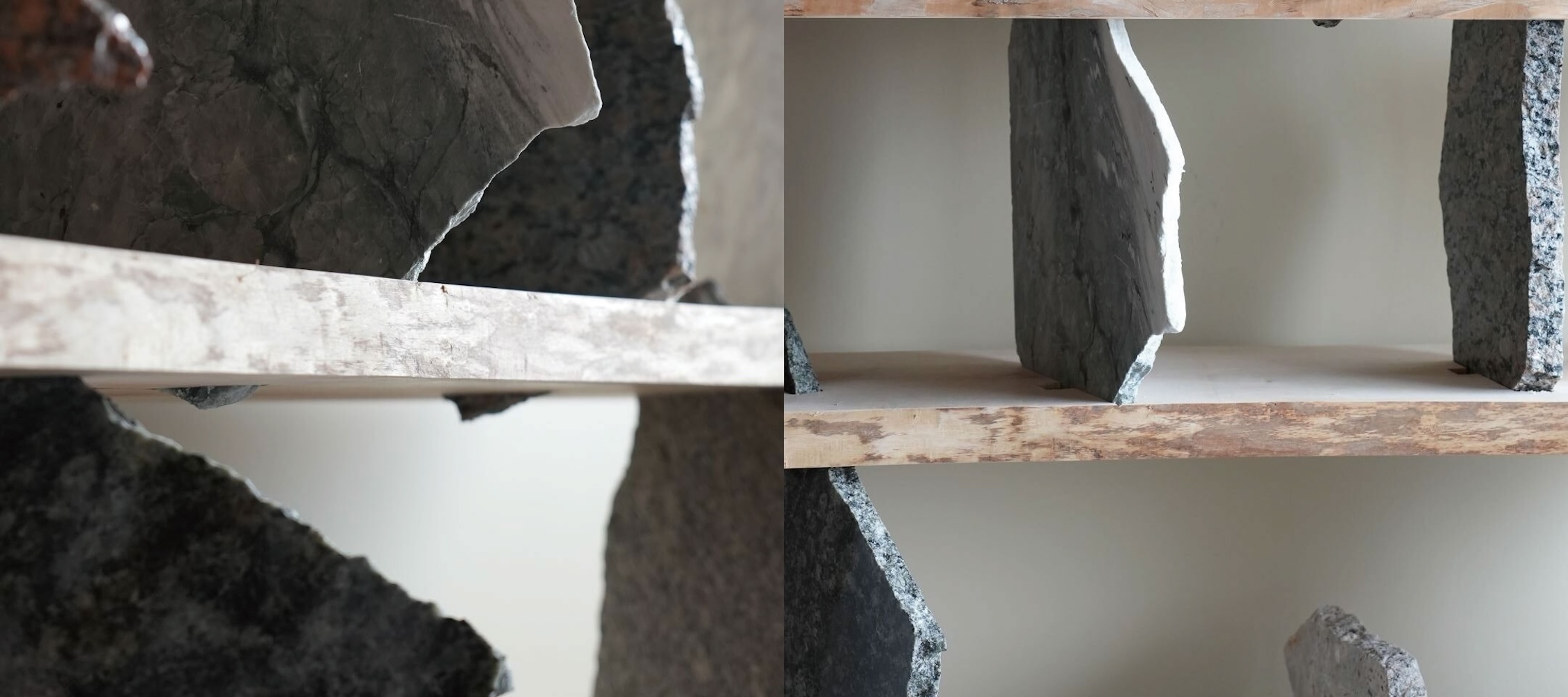 本作は、関ヶ原石材の石と飛騨の広葉樹を用い、それぞれの断片を整えず、揃えず、そのままの形状で交差させることで成立する、石と木の断片の出会いです。均一な材料ではなく、形の異なる断片どうしが並ぶことで生まれる状態を示しています。