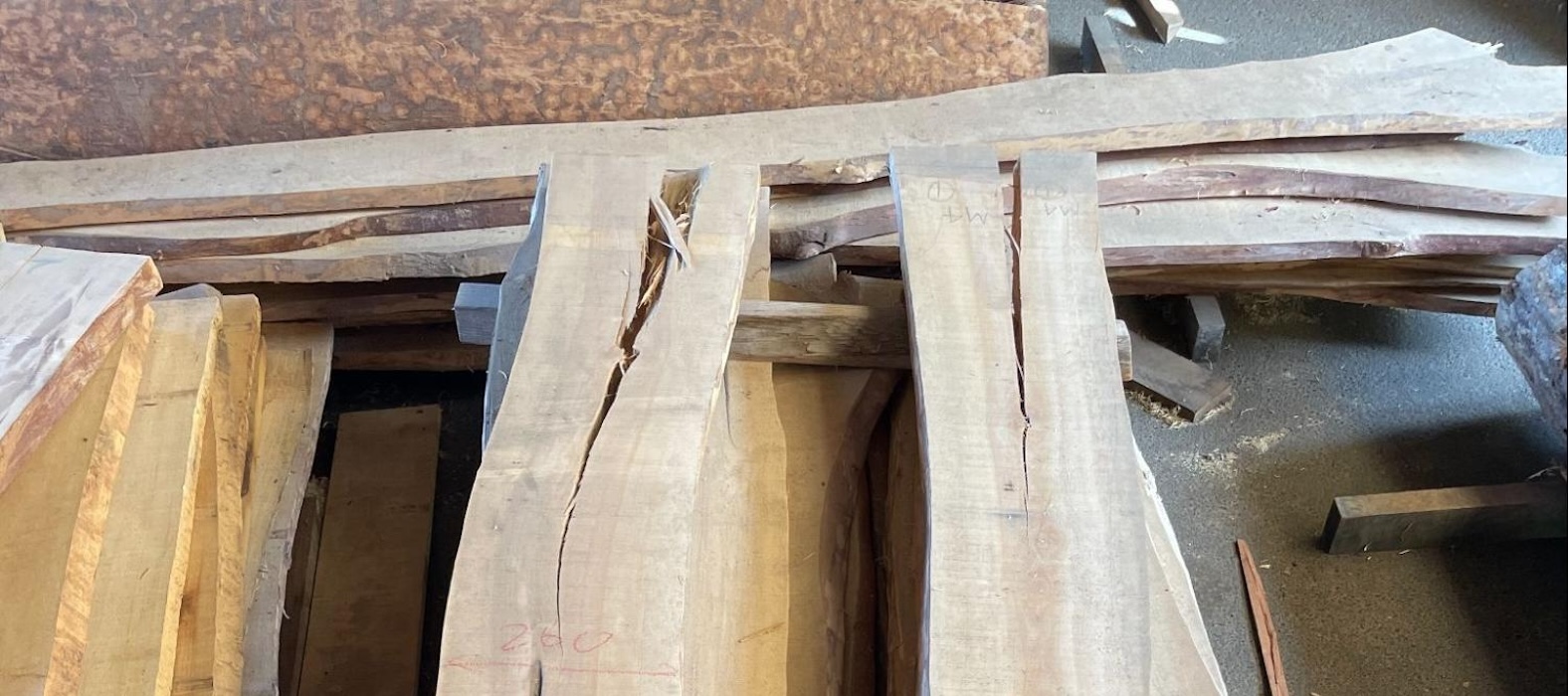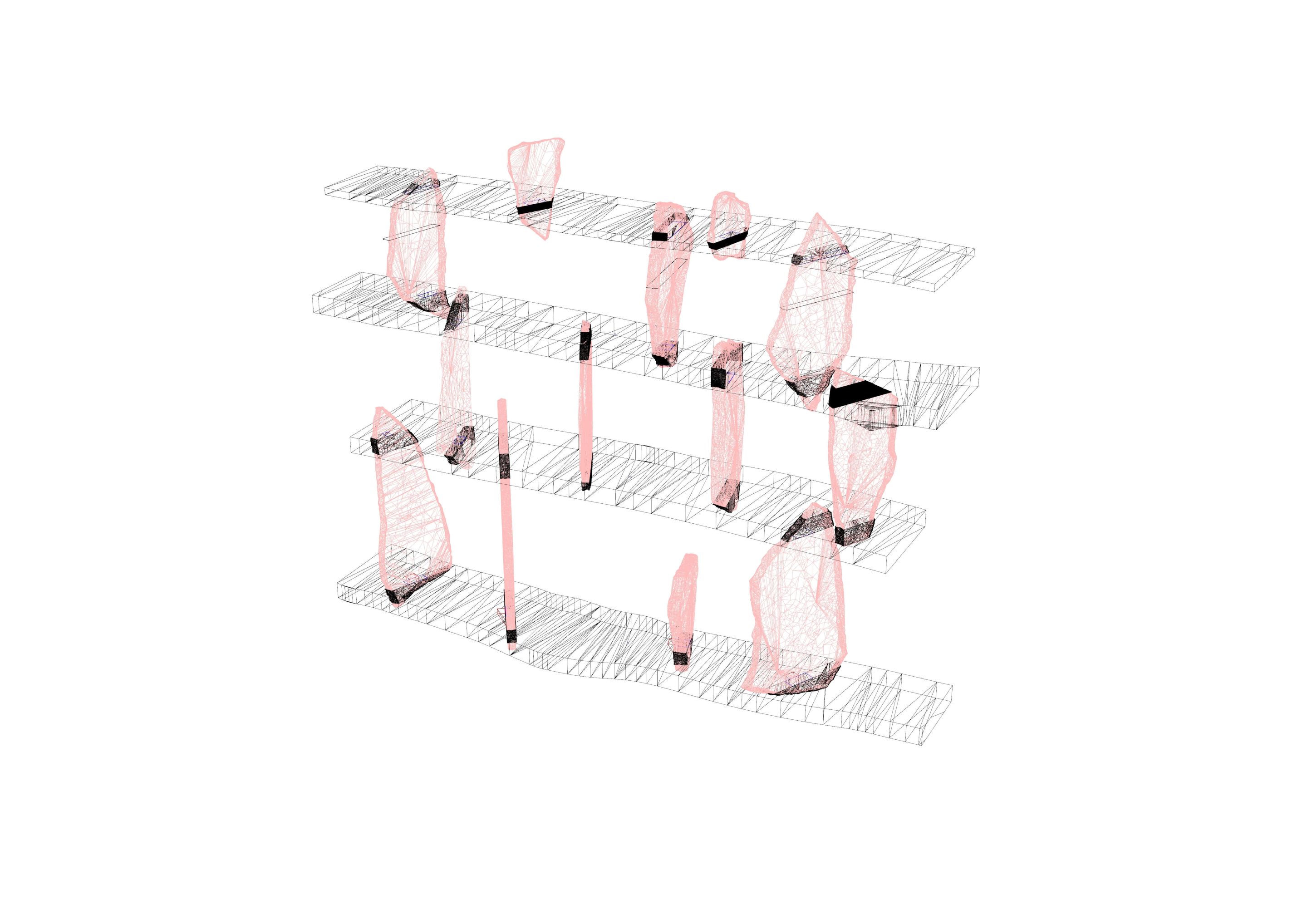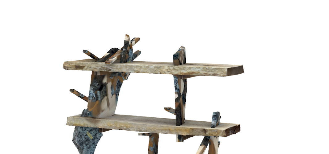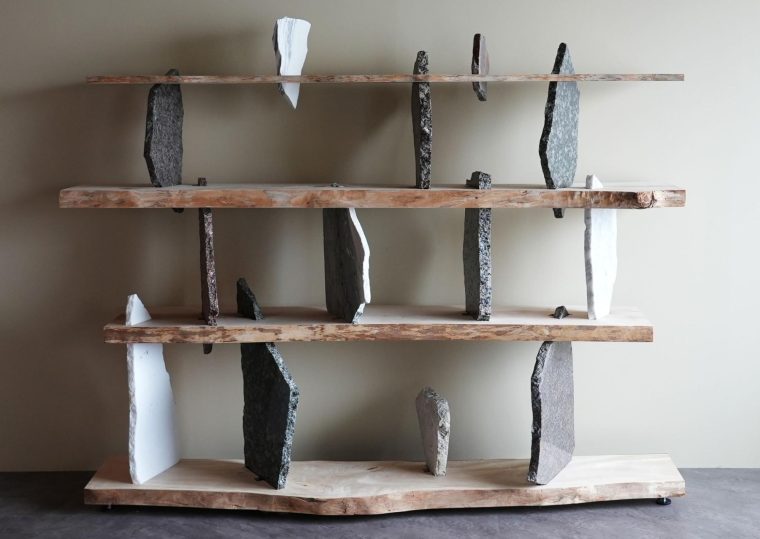 在庫の木材には、曲がりや節、厚みや幅のばらつきがあります。石の断片と組み合わせることで、それらを整えることなく扱い、共通の用途や文脈をもたない断片が、ひとつの姿として立ち上がっています。