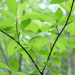 モクレン科モクレン属。ホオノキの由来は「包(ほう)」で、大きな卵型の葉っぱは、飛騨の郷土料理の朴葉寿司や朴葉味噌に代表されるように古くから食べ物を包む用途に使われてきた。皮は煎じて「厚木」という漢方薬になり下痢止めや健胃薬に、炭は金銀の研磨剤に。幅広い用途に使われる生活に役立つ木。大輪の白い花はとても良い香りがする。